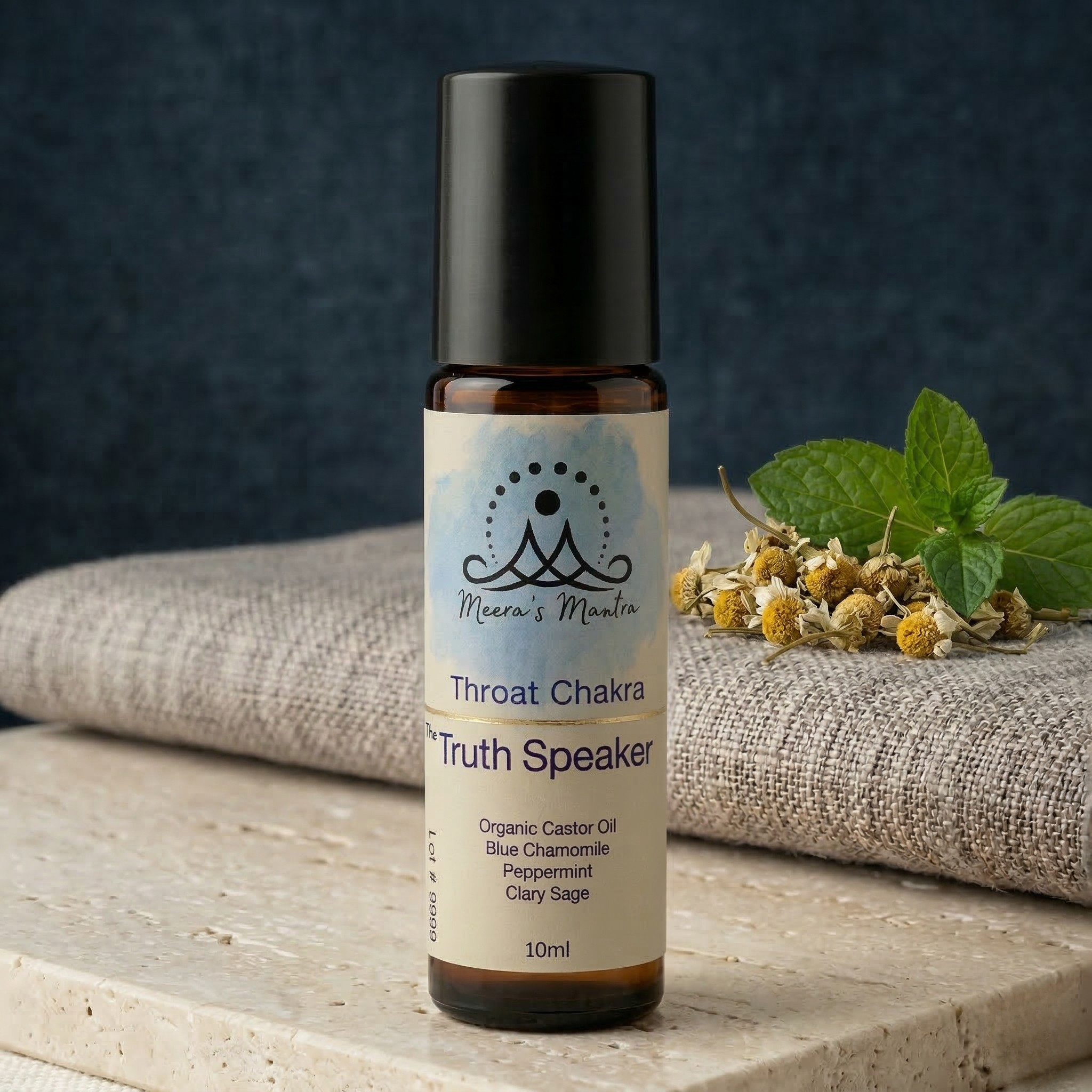 The Truth Speaker empowers authentic expression and supports thyroid health. This blend helps detoxify the thyroid and reduces inflammation or nodules. Blue Chamomile cools and soothes irritation—both physical and emotional—while Peppermint opens airways and clears the "fog" of miscommunication. The Lapis Lazuli roller, stone of self-awareness and truth, helps you speak your truth with calm rather than anger.